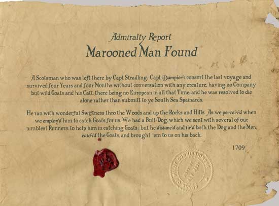 A Scotsman who was left there by Capt Stradling, Capt Dampier’s consort the last voyage and survived four Years and four Months without conversation with any creature, having no Company but wild Goats and his Catt, there being no European in all that Time, and he was resolved to die alone rather than submitt to ye South Sea Spainards.