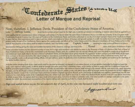 Invite  Captain Jeffery Lemma  to service in a private armed vessel on the high seas, to aid this government in resisting so wanton and wicked an aggression, to make application for commissions or letters of marque and reprisal, to be issued under the seal of these Confederate States; it is with the authority of the Congress of the Confederate States of America that I do enact as President of the Confederate States and hereby authorized to use the whole land and naval force of the Confederate States to meet the war thus commenced, and to issue to private vessels commissions or letters of marque and general reprisal, It is with this authority in such form as I shall think proper, under the seal of the Confederate States, against the vessels, goods, and effects of the United States, and of the citizens or inhabitants of those States and territories thereof; that property of the enemy shall be subject to seizure. And I do further notify  Captain Lemma   applying for these Letters of Marque to make a statement in writing, giving the name and suitable description of the character, tonnage, and force of the  Rascal , name of the place of residence of each owner concerned therein and the intended number of crew, and to sign each statement, and deliver the same to the Secretary of State or Collector of the Port of Entry of these Confederate States, to be by him transmitted to the Secretary of State, with the condition that the owners, officers, and crew who shall be employed on board such commissioned vessel, shall observe the laws of these Confederate States, and the instructions given them for the regulation of their conduct, and shall satisfy all damages done contrary to the tenor thereof by this vessel during her commission, and deliver up the same when revoked by the President of the Confederate States, And I do further specially enjoin on all persons holding offices, civil and military, under the authority of the Confederate States, that they be vigilant and zealous in the discharge of the duties incident thereto.