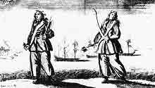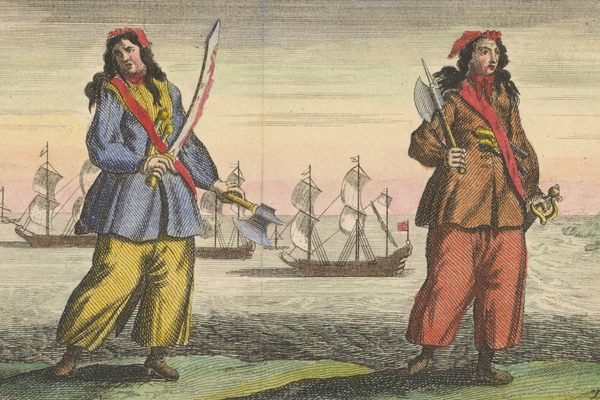… the two women, prisoners at the bar, were then on board the said sloop, and wore men’s jackets, and long trousers, and handkerchiefs tied about their heads; and that each of them had a machete and pistol in their hands, and cursed and swore at the men, to murder the deponent; and that they should kill her, to prevent her coming against them ;  and the deponent further said,that the reason of her knowing and believing them to be women then was by the largeness of their breasts. An other witness stated the women were very active on board, and that Ann Bonny handed gunpowder to the men ; also, “that when they saw any vessel, gave chase, or attacked, they wore men’s clothes ; and at other times, they wore woman’s clothes.”