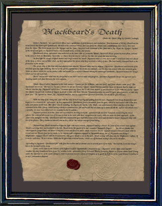 Some weeks later in the column of his logbook headed “Remarkable Occurencies &c,” Maynard noted: Little wind and fair weather this day I anchored here from N Carolina in the Adventure Sloop Edward Thache formerly Master (a Pyrat) whose head I hung under the Bowsprete of the Said Sloop in order to present it to ye Colony of Virginia & ye goods & Effects of the Said Pyrat I Deliver’d to my Commanders disposal.”