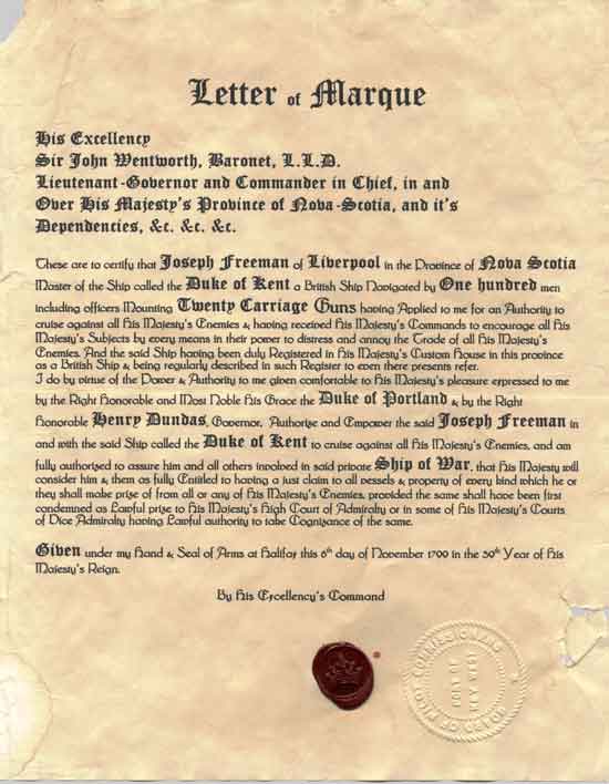 These are to certify that Joseph Freeman of Liverpool in the Province of Nova Scotia Master of the Ship called the Duke of Kent a British Ship Navigated by One hundred men including officers Mounting Twenty Carriage Guns having Applied to me for an Authority to cruise against all His Majesty‘s Enemies & having received His Majesty‘s Commands to encourage all His Majesty‘s Subjects by every means in their power to distress and annoy the Trade of all His Majesty‘s Enemies. And the said Ship having been duly Registered in His Majesty‘s Custom House in this province as a British Ship & being regularly described in such Register to even there presents refer.
