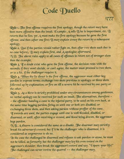 The Code Duello, covering the practice of dueling and points of honor, was drawn up and settled at Clonmel Summer Assizes, 1777, by gentlemen-delegates of Tipperary, Galway, Sligo, Mayo and Roscommon, and prescribed for general adoption throughout Ireland. The Code was generally also followed in England and on the Continent with some slight variations. In America, the principal rules were followed, although occasionally there were some glaring deviations. dueling had a long and undistinguished history in the U.S. Navy. One historian has claimed that between 1798 and 1848, thirty-six naval officers were killed in eighty-two duels, approximately two-thirds as many as died in combat during that same period.