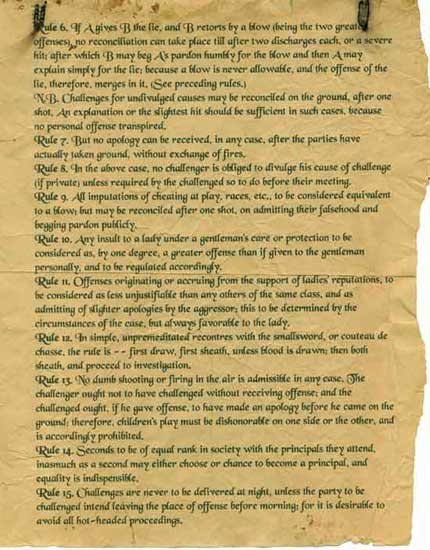Rule 4. When the lie direct is the first offense, the aggressor must either beg pardon in express terms ; exchange two shots previous to apology; or three shots followed up by explanation; or fire on till a severe hit be received by one party or the other.