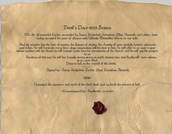 We, the all-powerful Lucifer, seconded by Satan, Beelzebub, Leviathan, Elimi, Astaroth, and others, have today accepted the pace of alliance with Urbain Grandier, who is on our side.