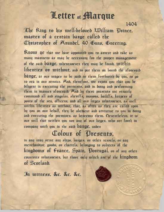 And by these presents we straitly command all and singular, sheriffs, mayors, bailiffs, keepers of ports of the sea, officers, and all our lieges whatsoever, as well within liberties as without, that, as often as they are called upon by you on our behalf, they be obedient and attentive to you in doing and executing the premises, as beseems them. Nevertheless, it is our will that neither you nor any of our lieges, who set forth in company with you in the said barge, under Colour of Presents