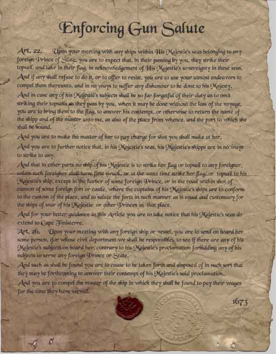 Art. 22.Upon your meeting with any ships within His Majestie’s seas belonging to any foreign Prince of State, you are to expect that, in their passing by you, they strike their topsail, and take in their flag, in acknowledgement of His Majestie’s sovereignty in these seas.