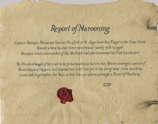 Captain Dampier Marooned Samuel Huxford at St. Jago (now Sao Tiago) in the Cape Verde Islands where he died three months later ’partly with hunger’.