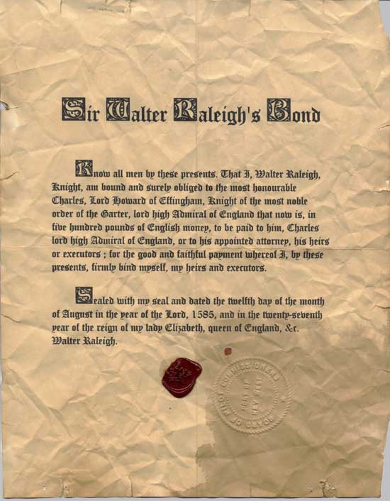 Know all men by these presents. That I, Walter Raleigh, Knight, am bound and surely obliged to the most honourable Charles, Lord Howard of Effingham, Knight of the most noble order of the Garter, lord high Admiral of England that now is, in five hundred pounds of English money, to be paid to him, Charles lord high Admiral of England, or to his appointed attorney, his heirs or executors ; for the good and faithful payment whereof I, by these presents, firmly bind myself, my heirs and executors.